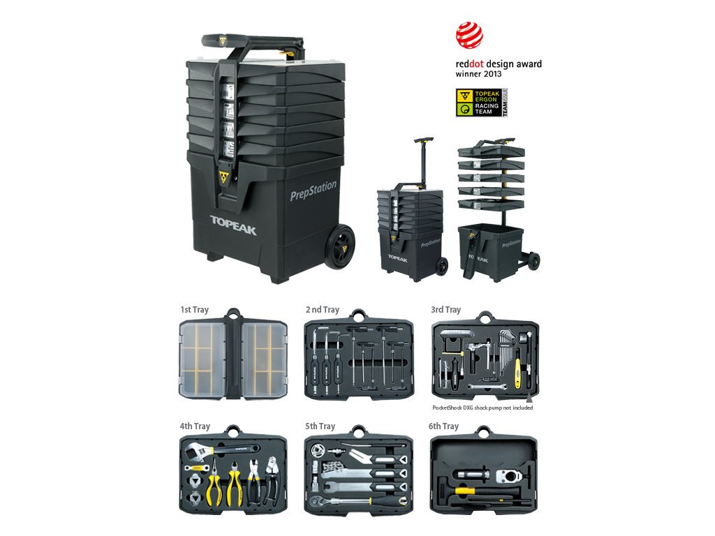 Kompletní profesionální dílna na kolečkách. Topeak PrepStation přináší 52 kusů špičkového nářadí s 80 funkcemi, přehledně uspořádaných v šesti otočných a výsuvných patrech. Ať už servisujete kolo v garáži nebo na závodech v depu, s touto stanicí máte vše potřebné okamžitě po ruce.