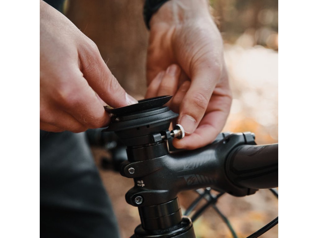 VACUUM MAGNETICKÝ DRŽÁK NA TELEFON DO VÍČKA PŘEDSTAVCE se skládá ze speciálního víčka představce, které je přišroubováno k hlavové trubce. Základna je poté umístěna na víčko a je snadno zajištěna svorkou pomocí drážkovaného šroubu nebo proti krádeži pomocí šestihranného šroubu. Základna z víčka tak může být rychle odstraněna, když není potřeba smartphone, zatímco obyčejná zátka zůstane přišroubovaná ke kolu.
