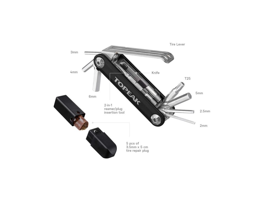 Nástroje: | • 2 / 2.5 / 3 / 4 / 5 / 6 mm inbusy • T25 Torx® klíč • Montpáka z tvrzené ocelir • Nůž • Nástroje pro opravu bezdušového systému (Stainless steel 2-in-1 tire reamer / plug insertion tool) |