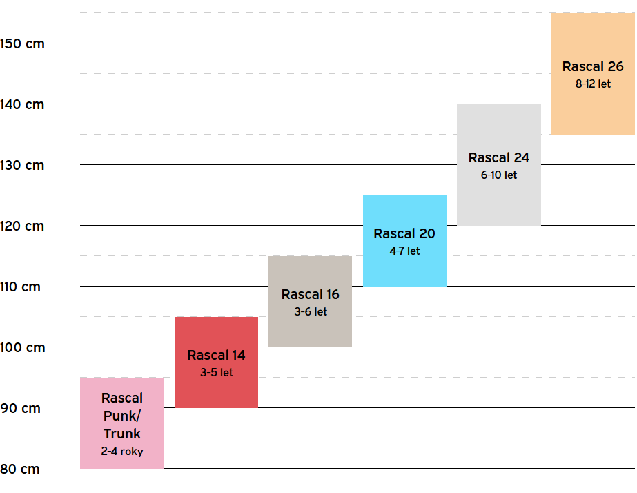 - Ideální poměr převodů: Každý model jízdního kola Rascal je vybaven individuálním rozsahem převodů, které vyhovují jezdci daného věku.