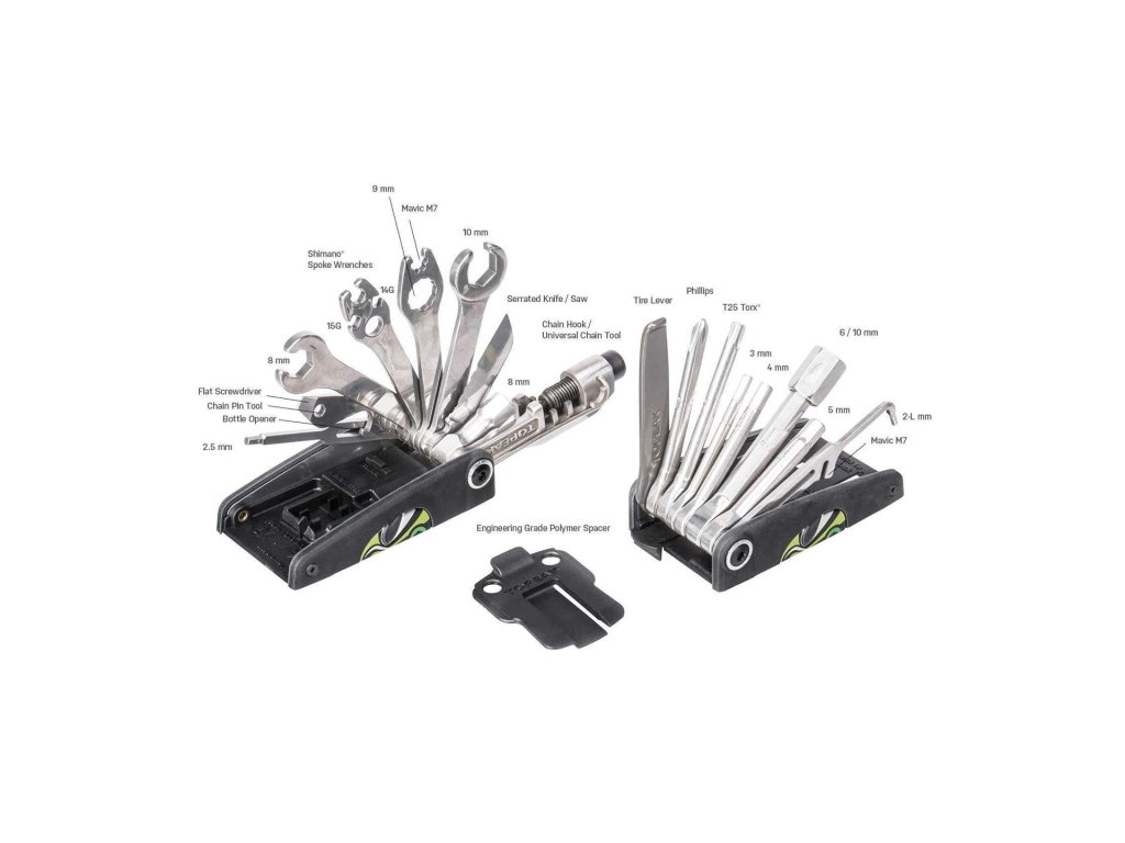 - 31 profesionálních funkcí: Obsahuje vše od precizních imbusů (až po 10 mm) přes Torx® T25 až po kompletní sadu centrovacích klíčů (včetně specifických pro Shimano® a Mavic®).
