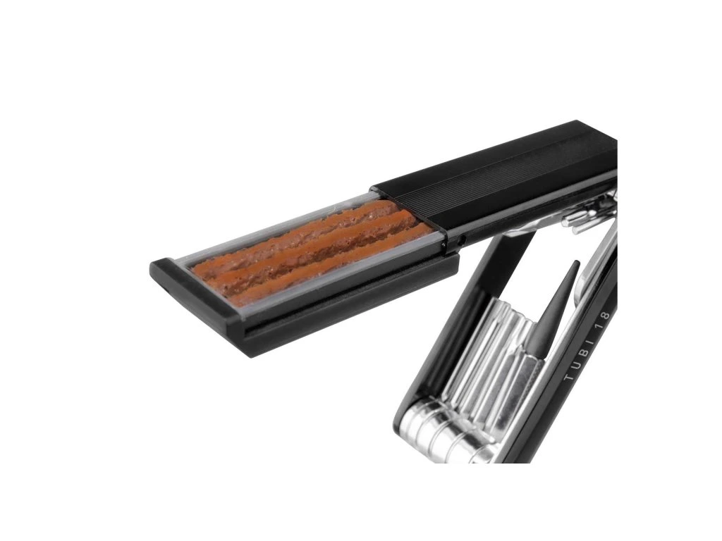 Vše, co potřebujete pro bezdušovou jízdu, v jednom prémiovém balení. Topeak Tubi 18 je vysoce precizní multiklíč s 18 funkcemi, který byl stvořen pro náročné cyklisty. Vedle široké škály imbusů a Torx klíčů nabízí kompletní bezdušový servis: nerezovou jehlu pro aplikaci knotů, nůž pro jejich začištění a unikátní integrovanou schránku, která uchovává opravné knoty v čistotě a bezpečí. Ideální volba pro jezdce, kteří chtějí maximální výbavu v minimalistickém černém provedení.