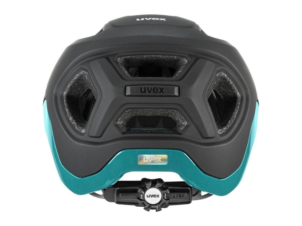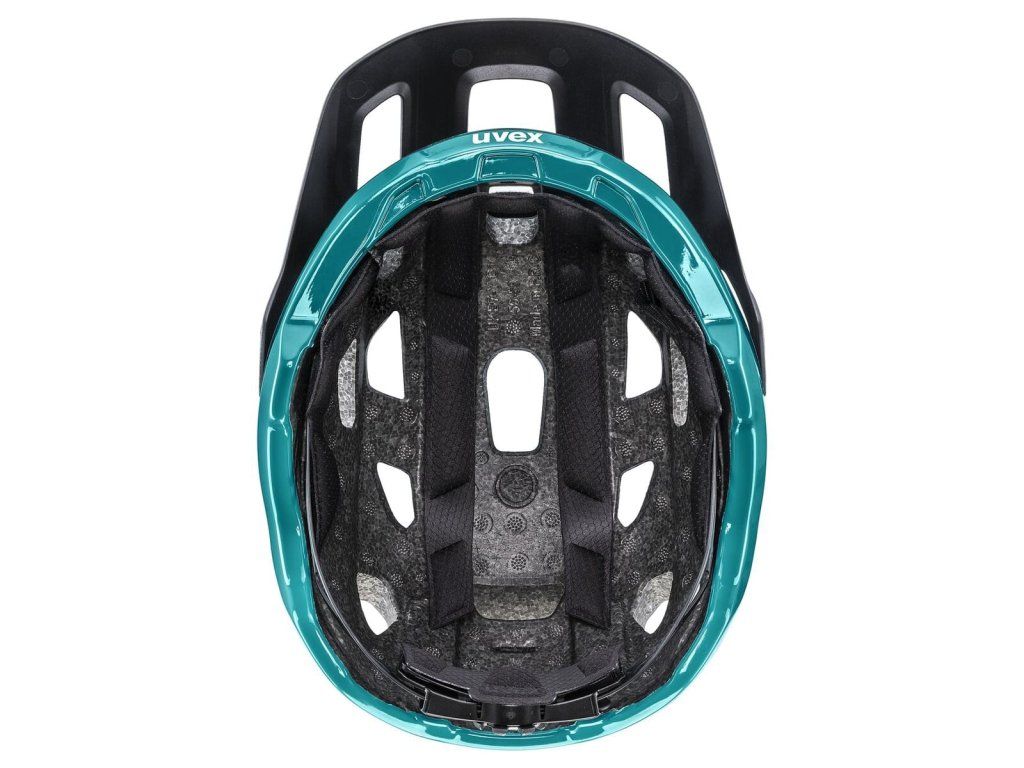 Helma Uvex React Black Teal Matt je navržena tak, aby stabilně seděla na hlavě a poskytovala ochranu i při svižnější jízdě nebo průjezdu technickými pasážemi.