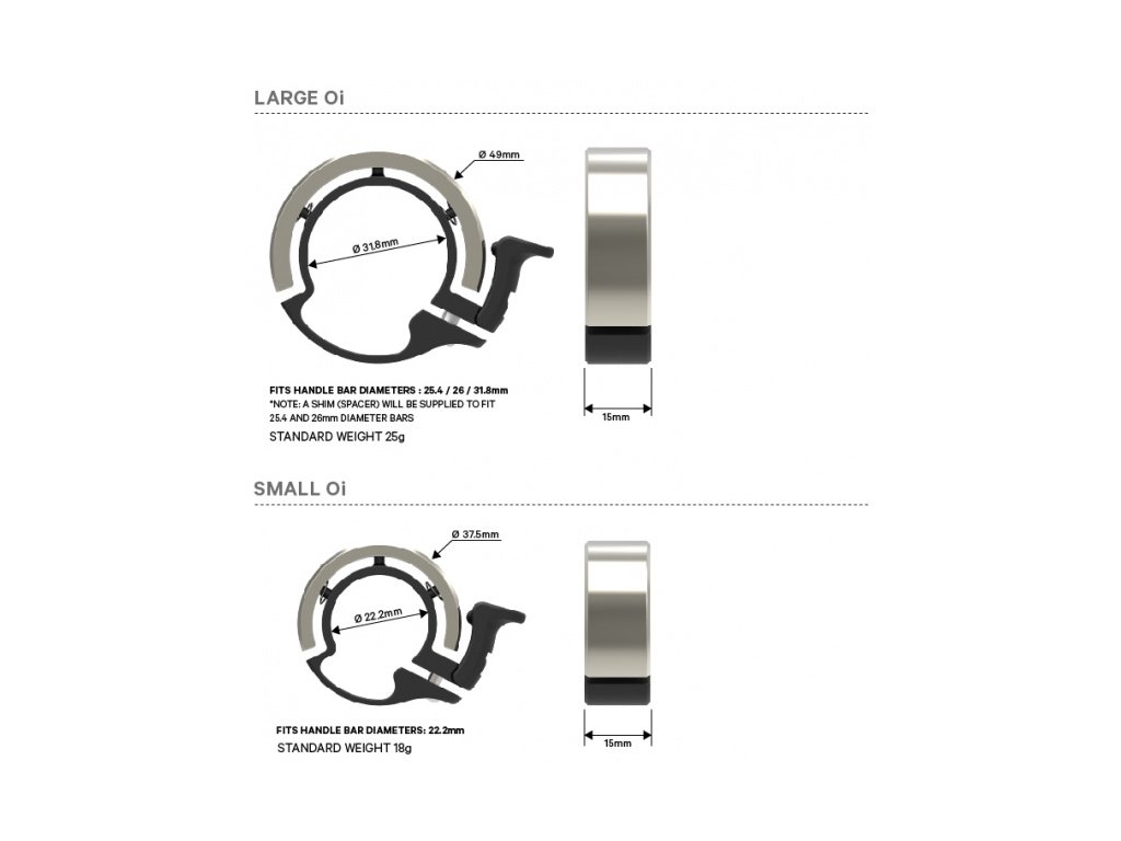 Malý zvonek Oi se hodí na řídítka s průměrem 22,2mm, což je např. horské kolo (blízko gripů), BMX a klasické městské kola. Velký zvonek Oi se hodí na řídítka s průměrem 23,8 až 31,8mm.